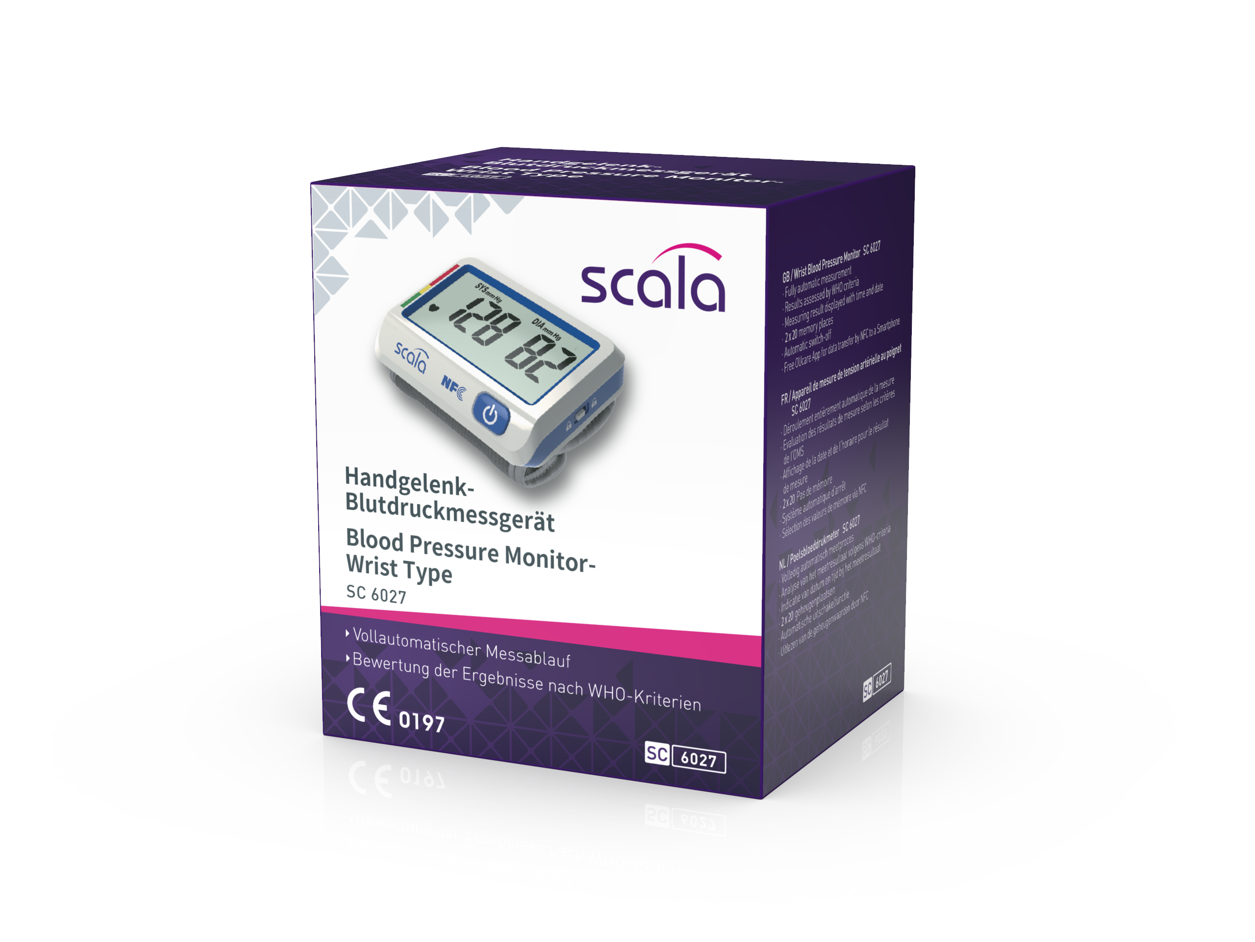 Das Blutdruckmessgerät SC 6027 ist ein elektronisches Gerät für die nicht invasive Selbstmessung des menschlichen Blutdruckes und der Pulsfrequenz von Erwachsenen nach oszillometrischer Messmethode am entblößten linken Handgelenk in häuslicher Umgebung bei Raumtemperatur. Die Messung des Blutdrucks erfolgt rund um das entblößte linke Handgelenk. Wenn es nicht möglich ist, die Messung am linken Handgelenk durchzuführen, benutzen Sie das rechte Handgelenk. Das Blutdruckmessgerät besitzt einen WHO-Indikator. Dieser ordnet die Messwerte entsprechend den Richtlinien der Weltgesundheitsorganisation WHO ein. Nach erfolgreicher Messung werden der systolische und diastolische Blutdruck sowie der Puls zugleich angezeigt. Die ermittelten Werte können per NFC auf ein Smartphone oder Tablet übertragen werden. Dazu installieren Sie bitte die kostenlose App BPM OUcare von Google Play oder dem App Store.