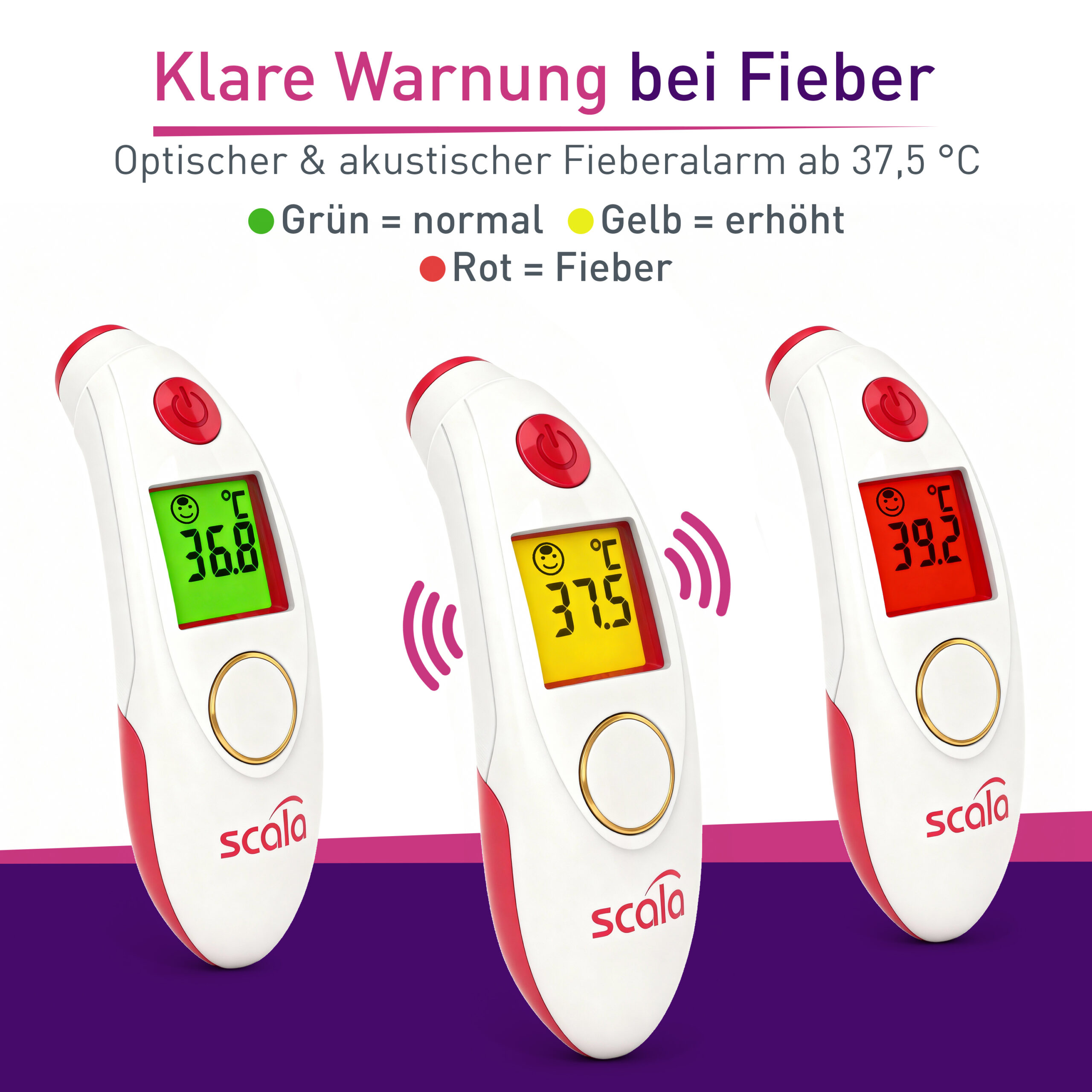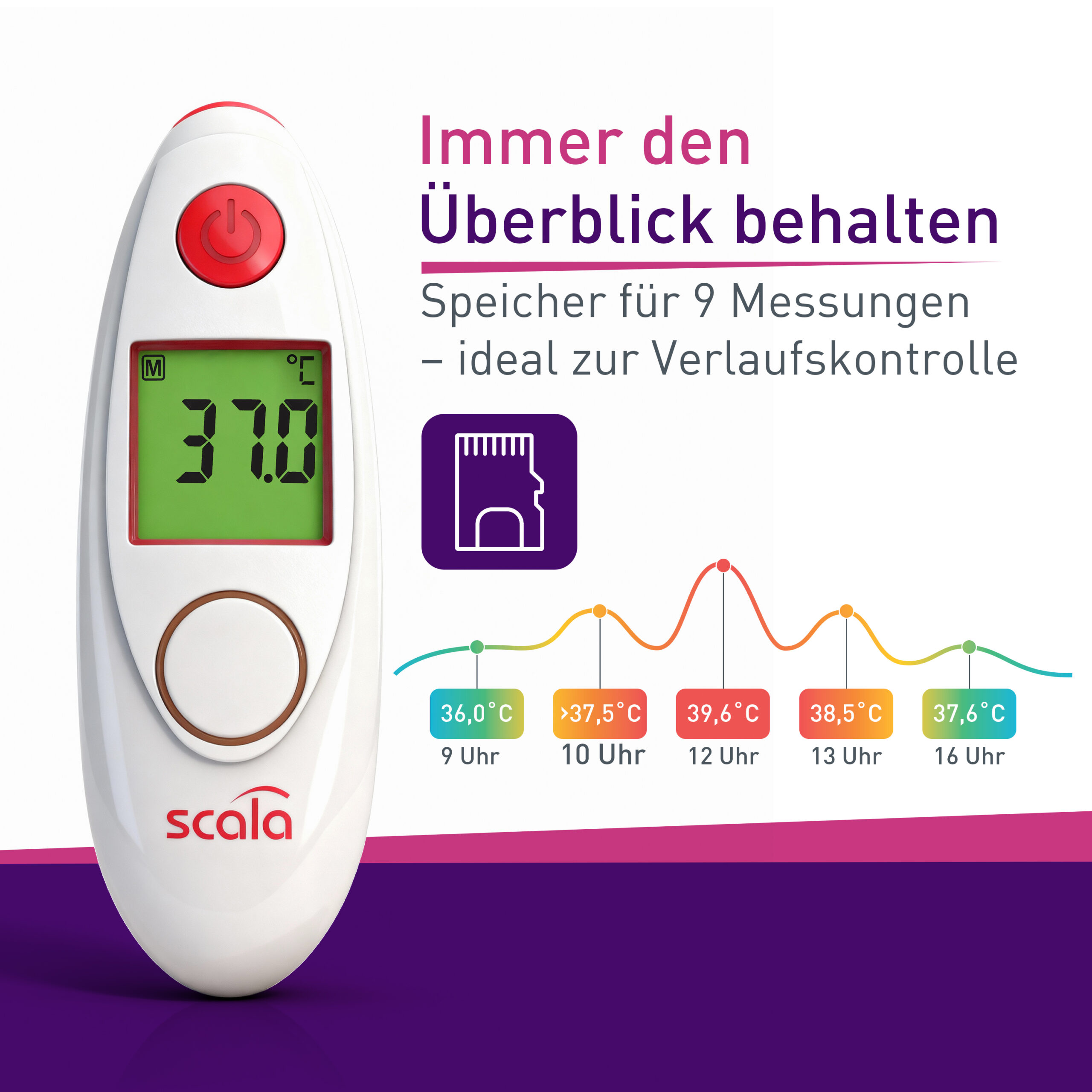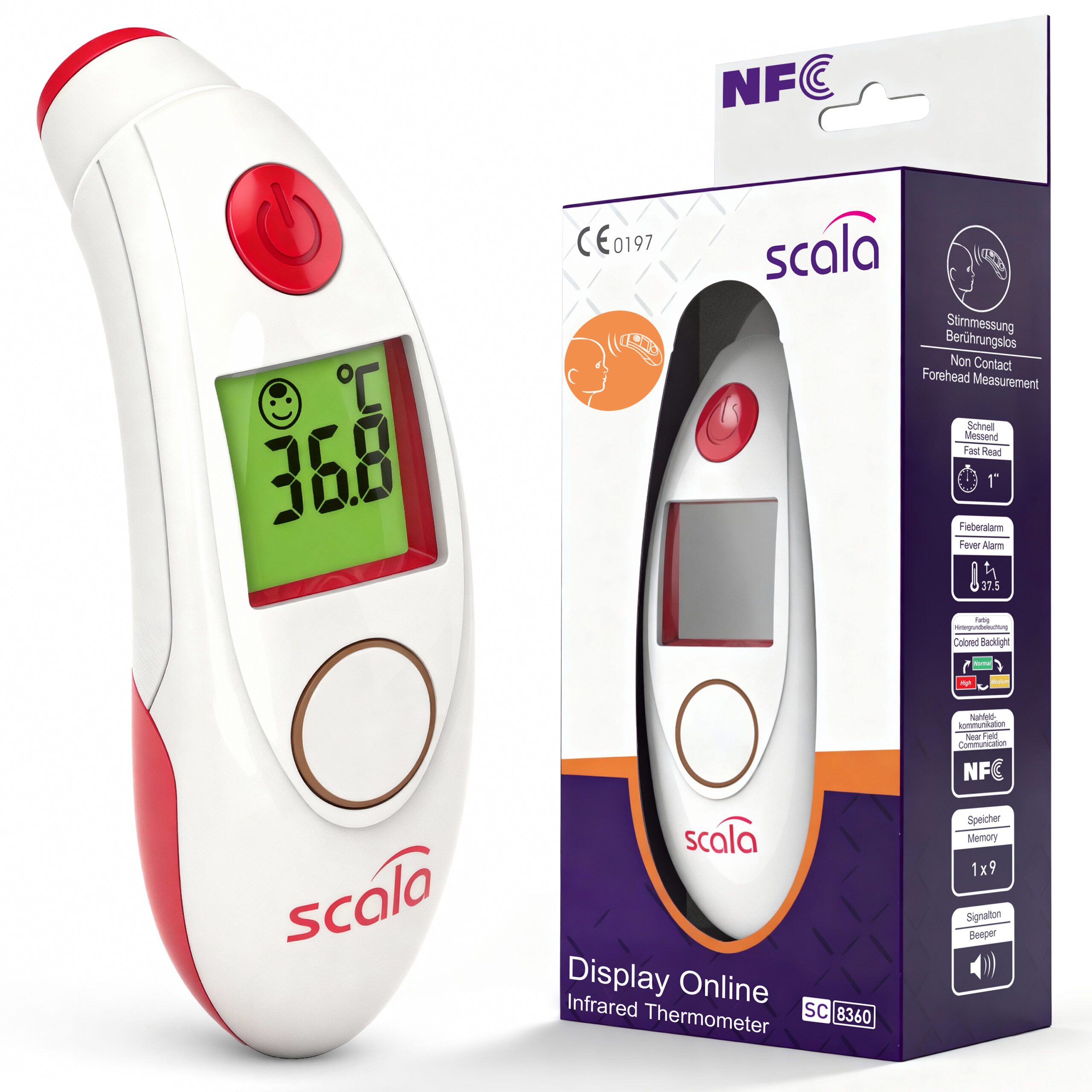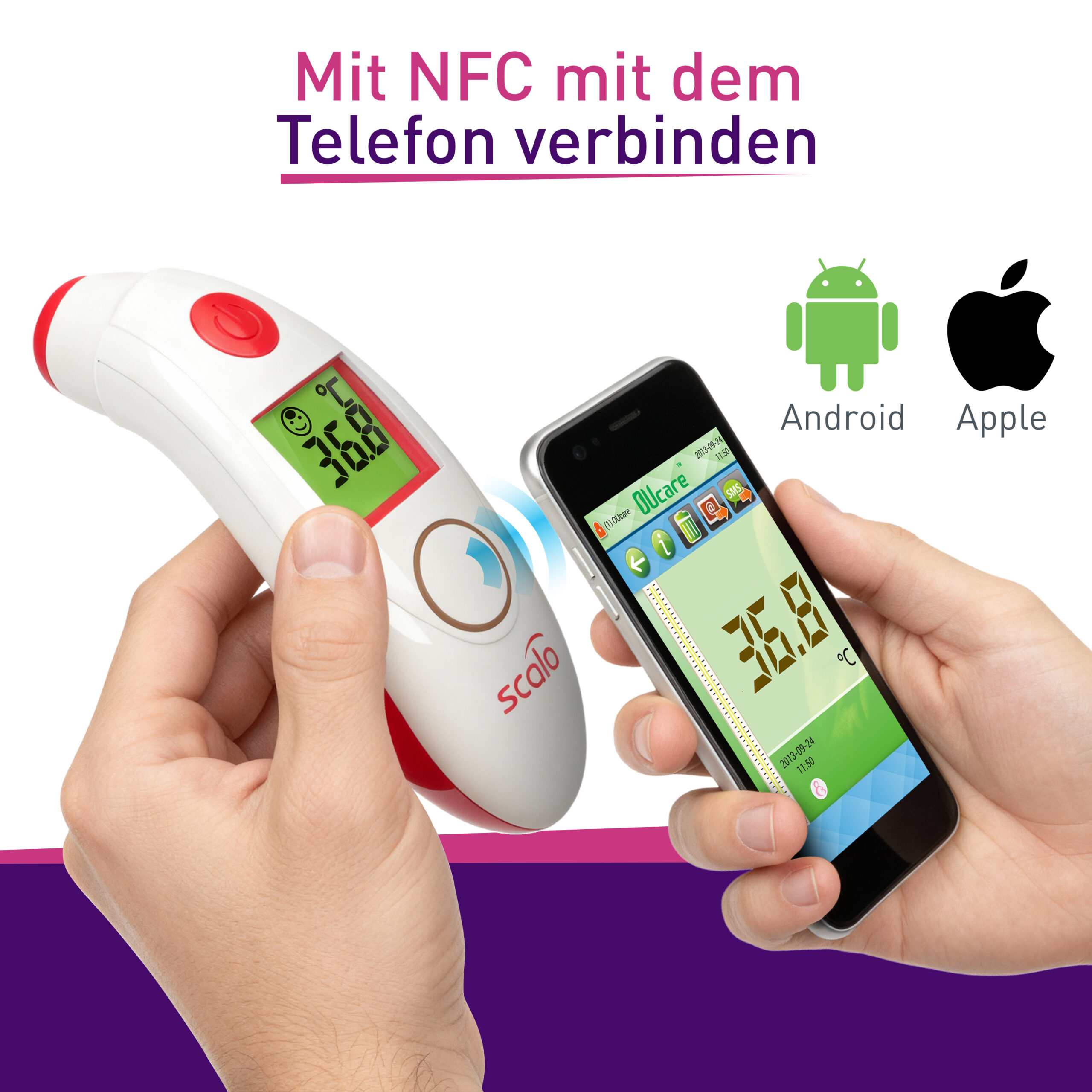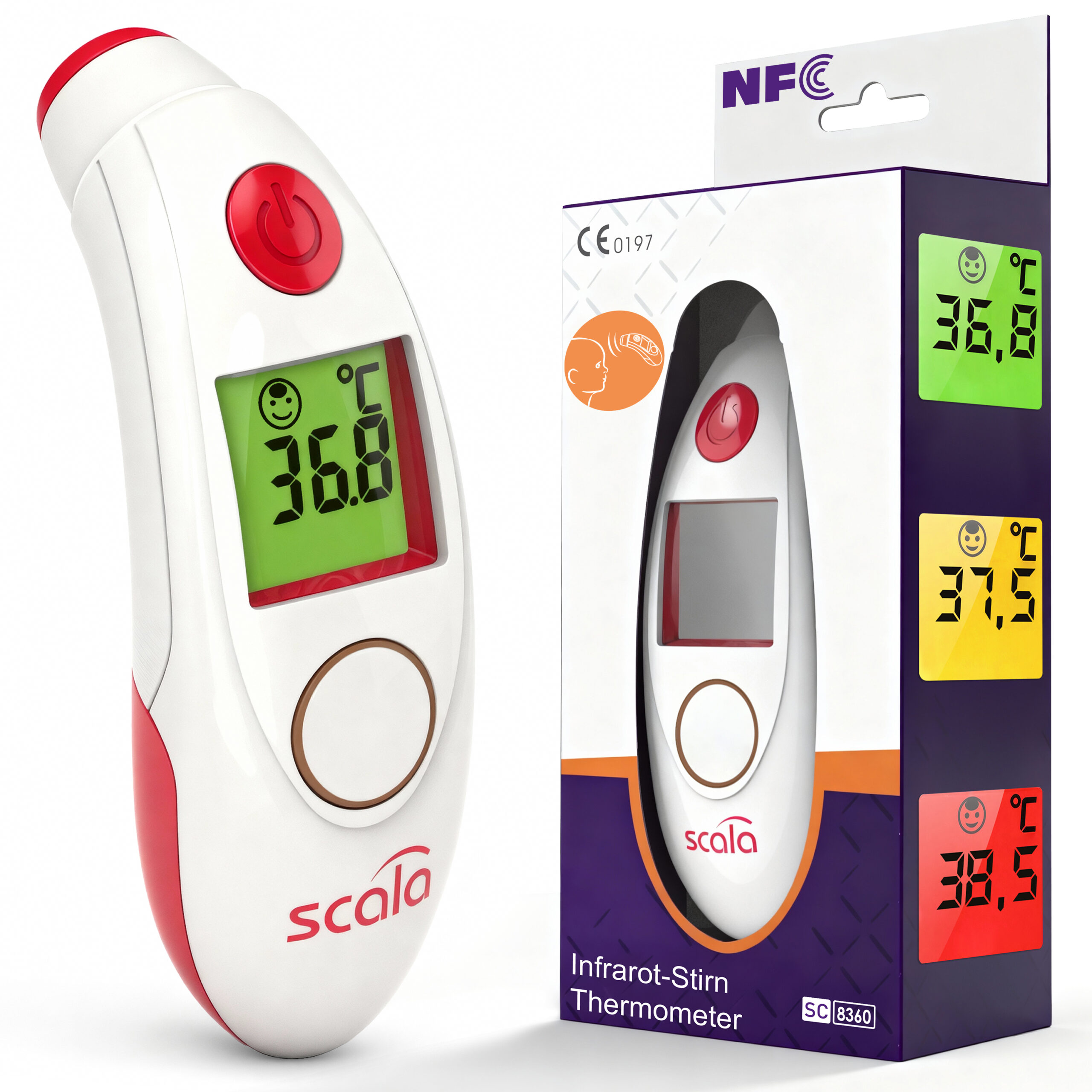 Mit dem Infrarot-Stirn-Thermometer SC 8360 ist die menschliche Körpertemperatur schnell und bequem ermittelt. Die Messstelle ist die Stirn. Die Körpertemperatur wird durch Auswertung der Infrarotstrahlung ermittelt. Das Gerät kann sowohl bei erwachsenen Patienten als auch bei Kindern eingesetzt werden. Das SC 8360 verfügt über einen integrierten Fieberalarm. Die Messung dauert 1 Sekunde. Nach erfolgreicher Messung werden die neun letzten Messwerte werden gespeichert werden. Die beigefügte Batterie hat eine Lebensdauer von etwa 3.000 Messungen. Installieren Sie die App OUcare von Google Play oder vom App Store. Mit der App OUcare können Sie nicht nur die Temperaturwerte auf ein Smartphone übertragen, sondern sie grafisch darstellen und Trends erkennen.