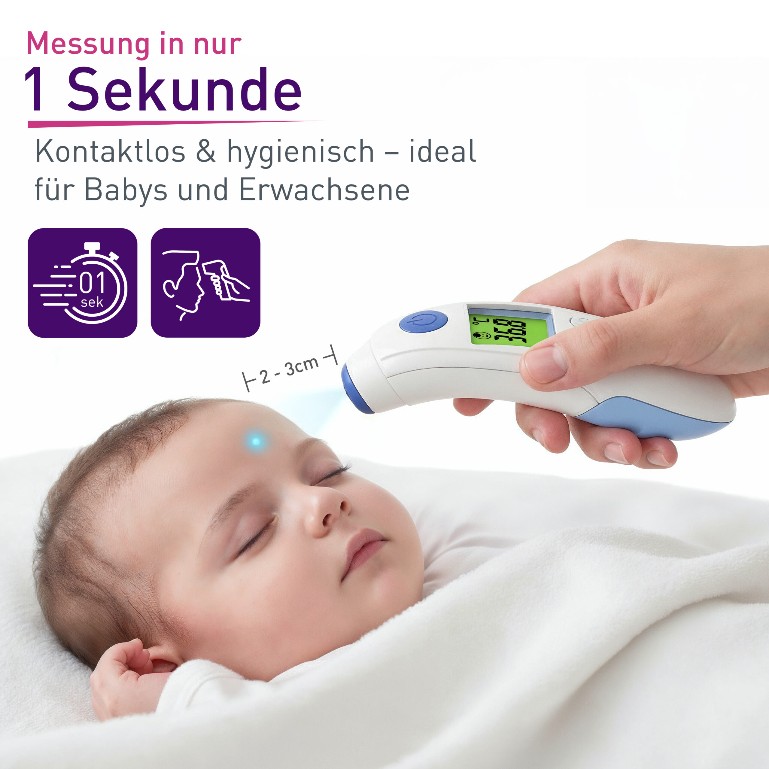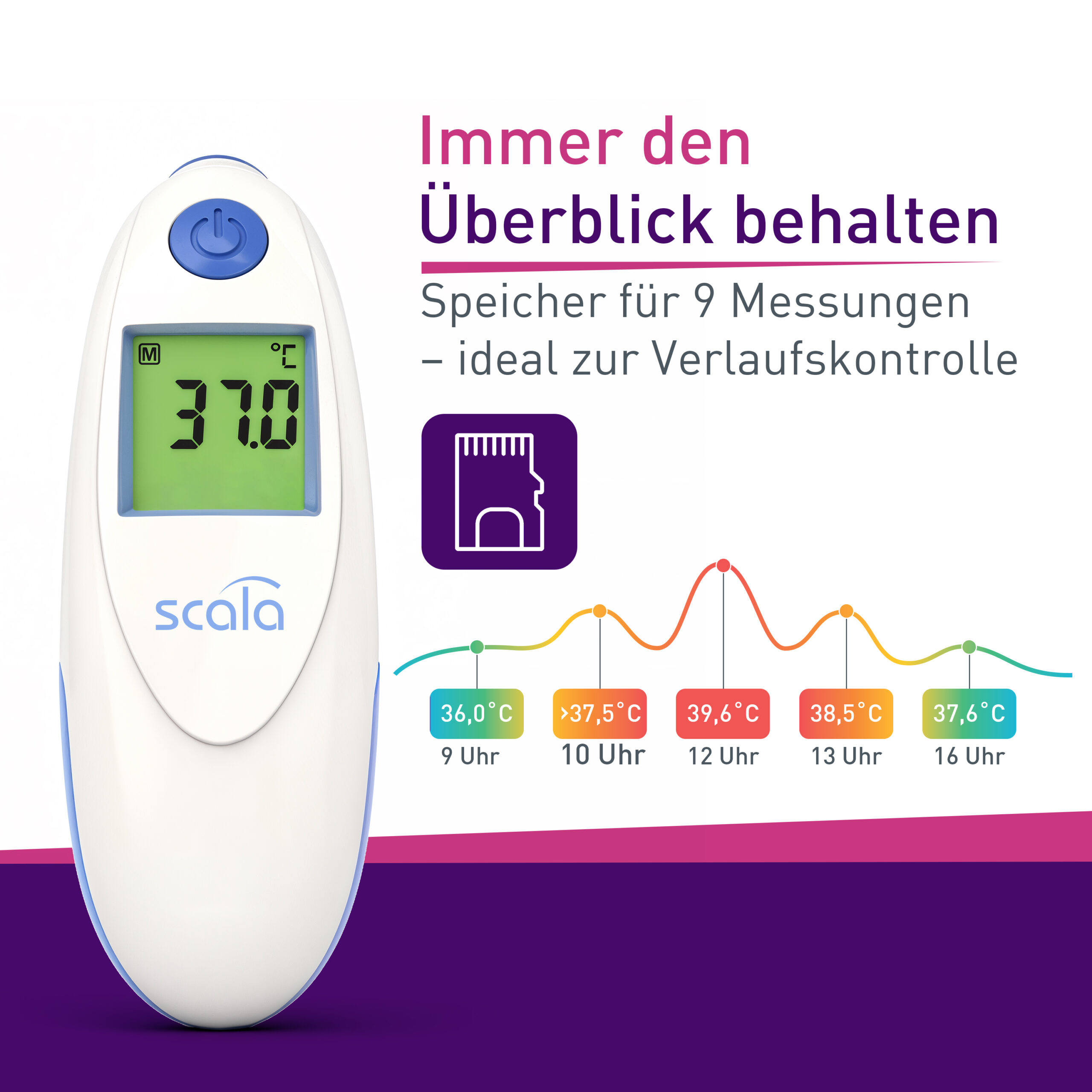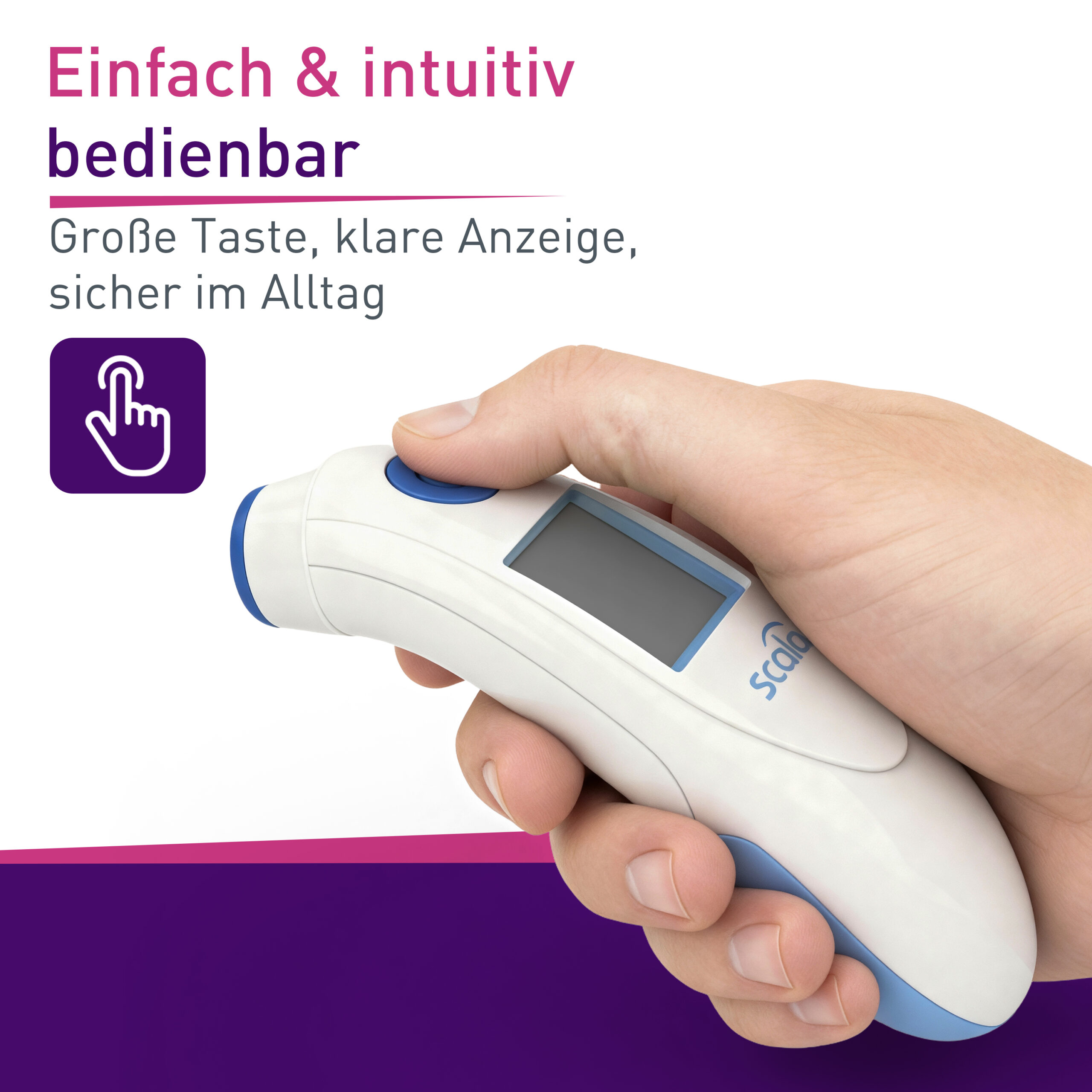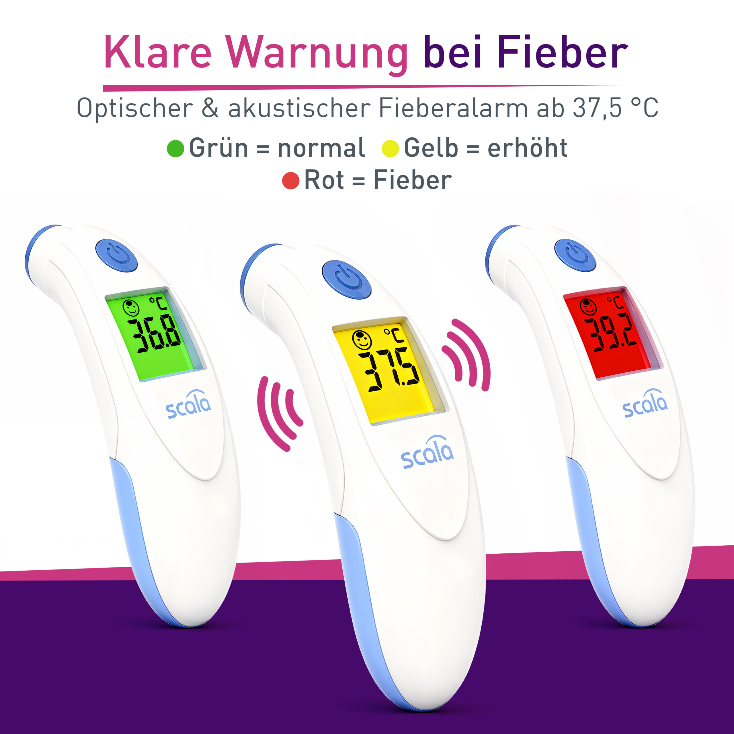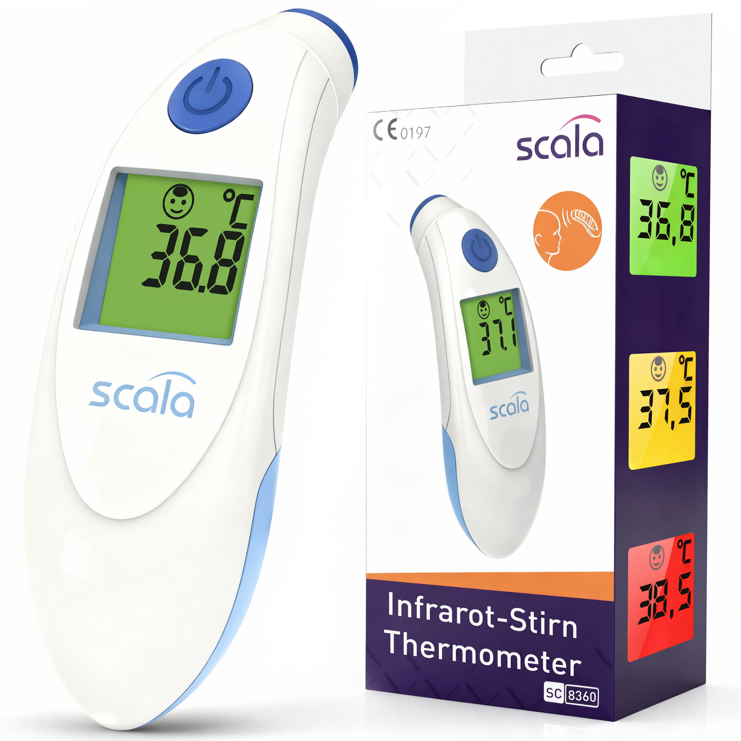 Bereichern Sie Ihre medizinische Ausstattung daheim mit dem kontaktlosen Infrarot-Fieberthermometer SC 8360 von SCALA in blau mit LED und Fieberalarm. Damit gelingt ein schnelles kontaktloses Fiebermessen mit einer Messung über der Stirn in nur ca. 1 Sekunde Messzeit.