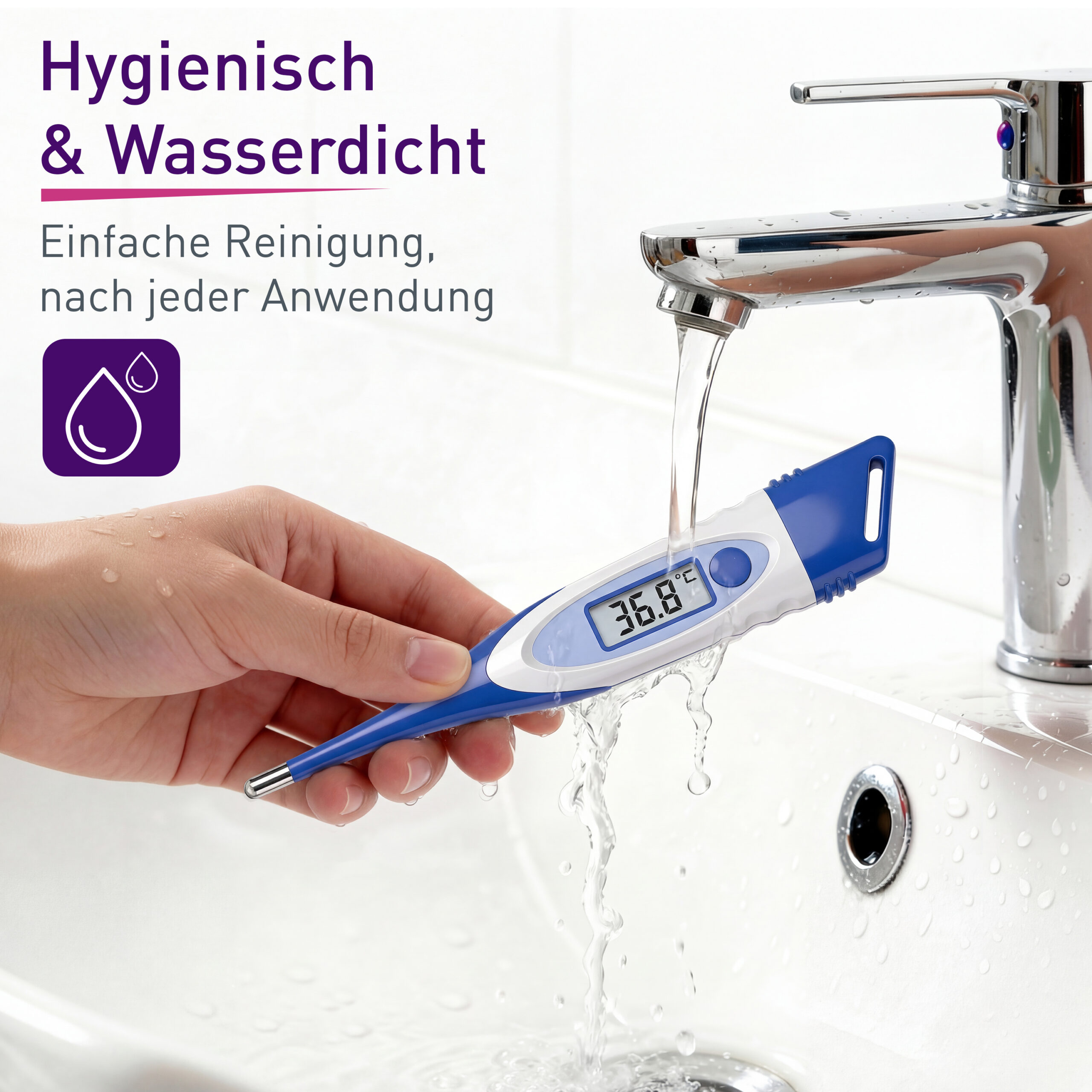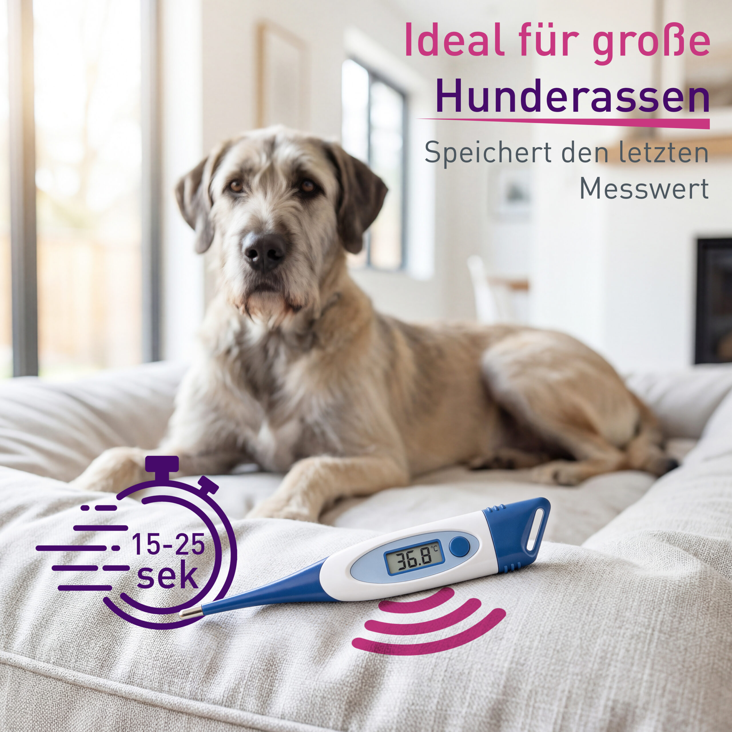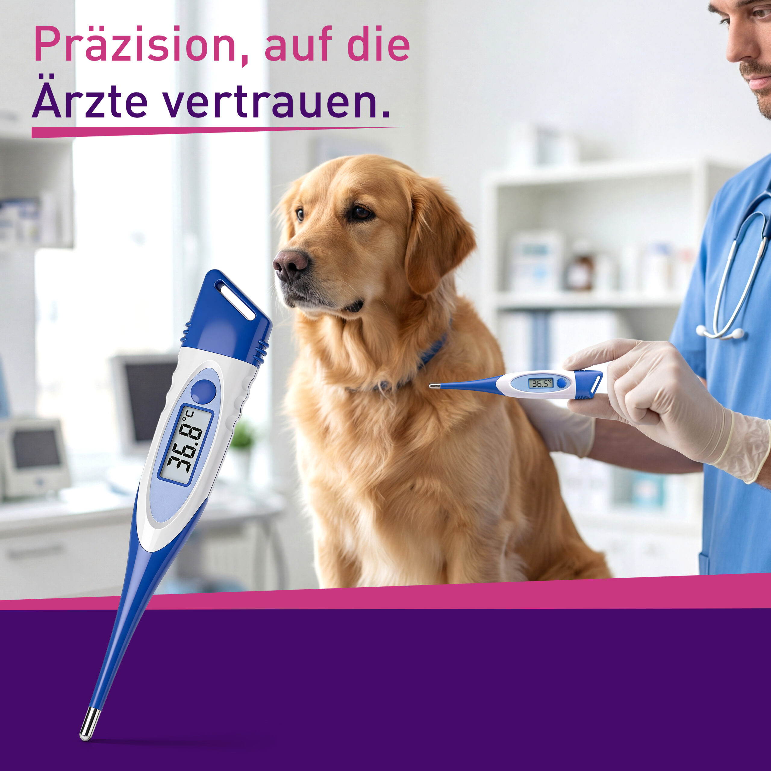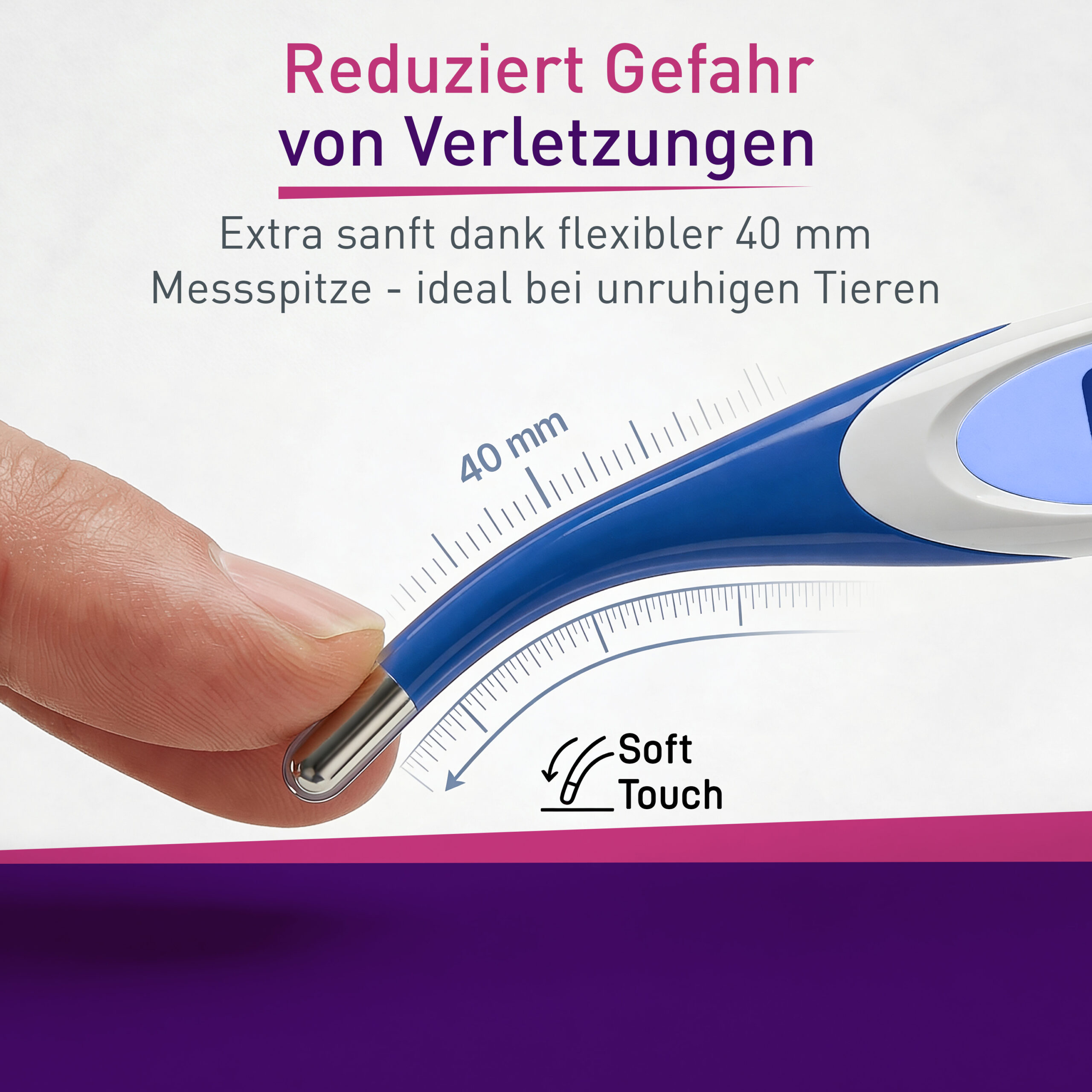 Das Veterinärthermometer wurde speziell für die Temperaturmessung bei Säugetieren entwickelt. Der Messbereich reicht bis 43,9 °C.