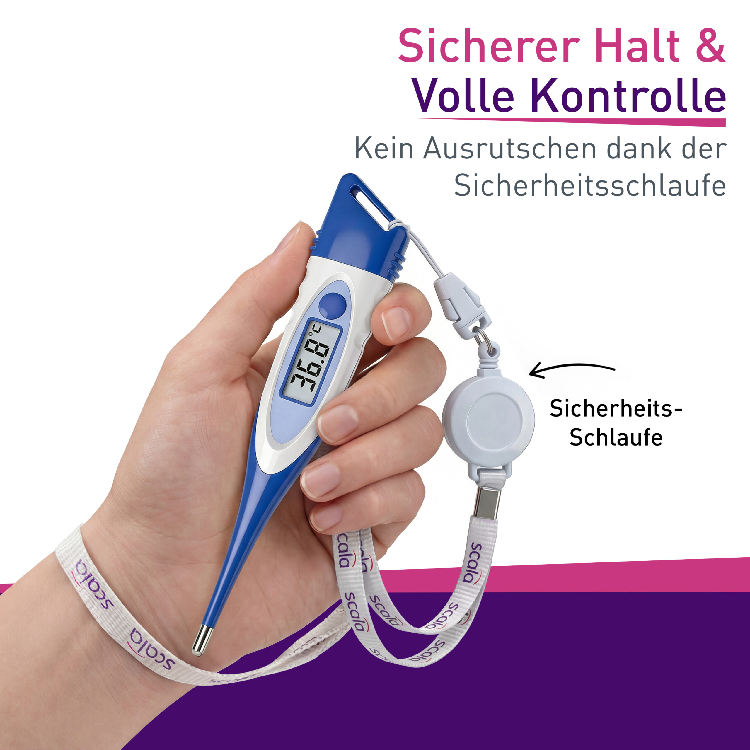 Als besonderes Feature besitzt das Thermometer eine Öse für ein Befestigungsband. Wenn das Band als Handschlaufe benutzt wird, rutscht das Thermometer auch bei unruhigem Verhalten oder Flucht des Tieres nicht aus der Hand.